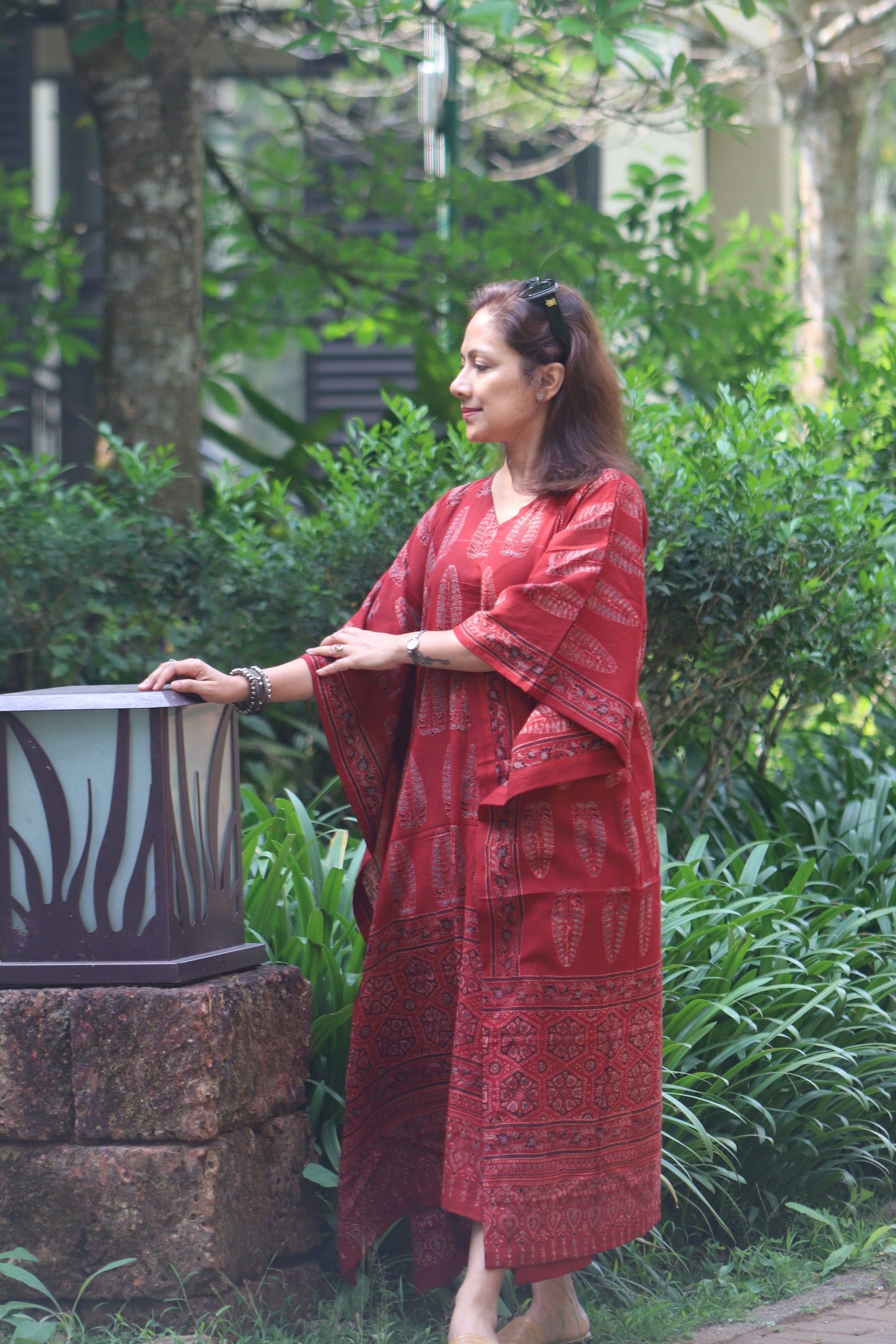 "Indulge in the beauty of nature with our Ajrakh dress in red. Handblock printed with intricate details, this dress exudes elegance and style. The rust red color adds a touch of sophistication, and the ankle length design makes it perfect for any occasion. Elevate your wardrobe with this timeless piece."