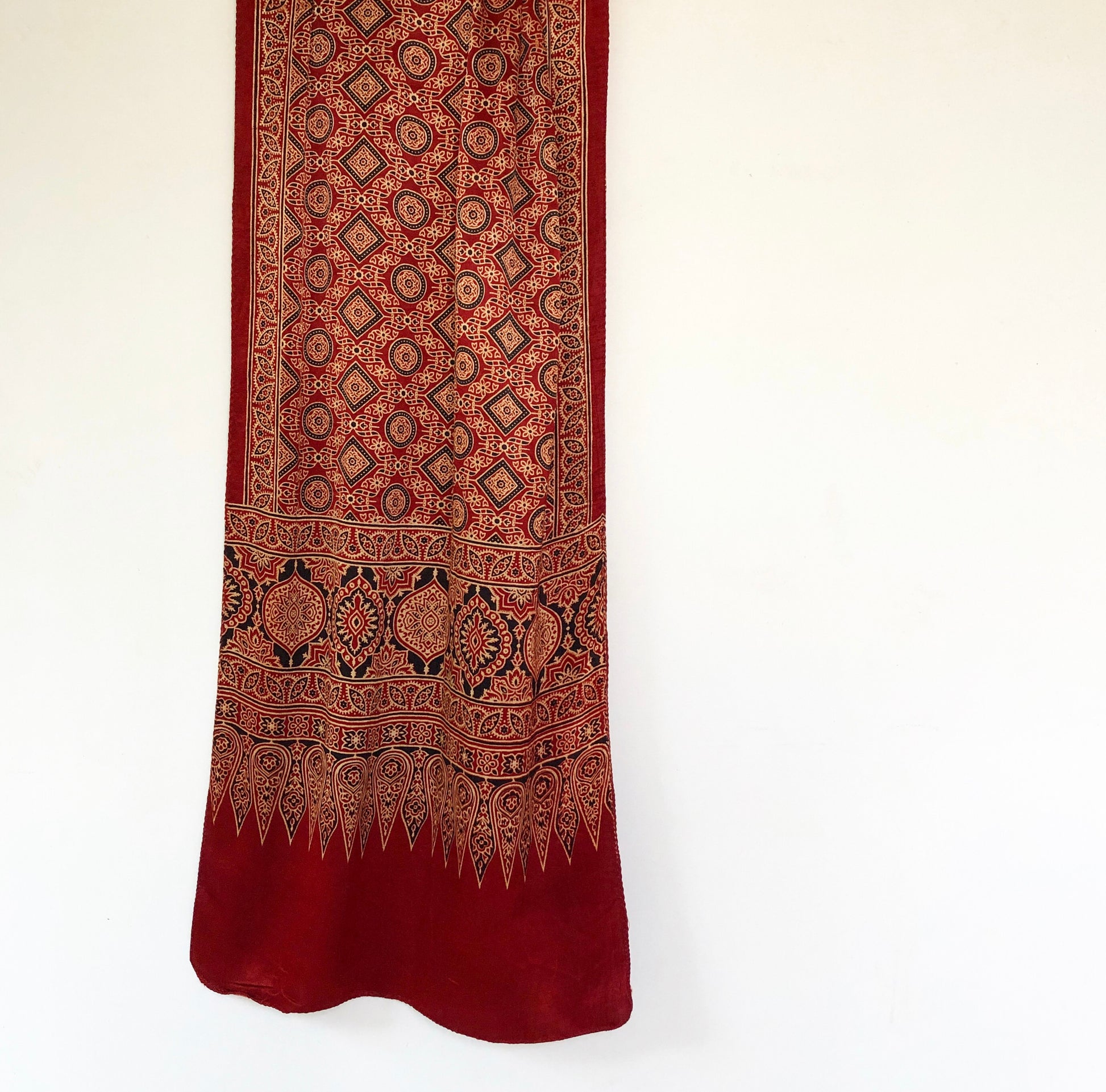 Experience the luxurious softness of our Ajrakh stole, made with the finest modal silk. This beautiful stole is not only stylish, but also offers a comfortable and silky feel against your skin. Elevate your outfit with this elegant and timeless accessory.