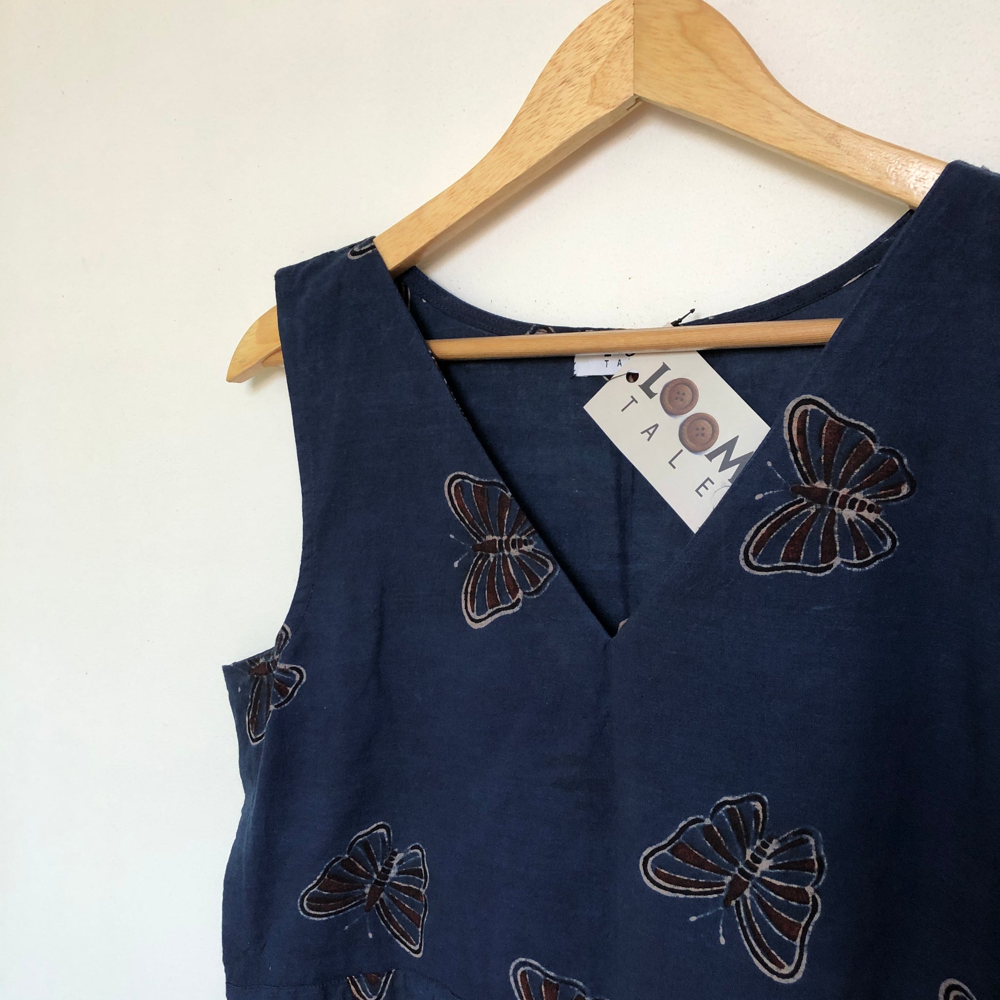 "Indulge in the beauty of nature with our butterfly dress in blue. Handblock printed with intricate details, this dress exudes elegance and style. The deep indigo blue color adds a touch of sophistication, and the knee length design makes it perfect for any occasion. Elevate your wardrobe with this timeless piece."