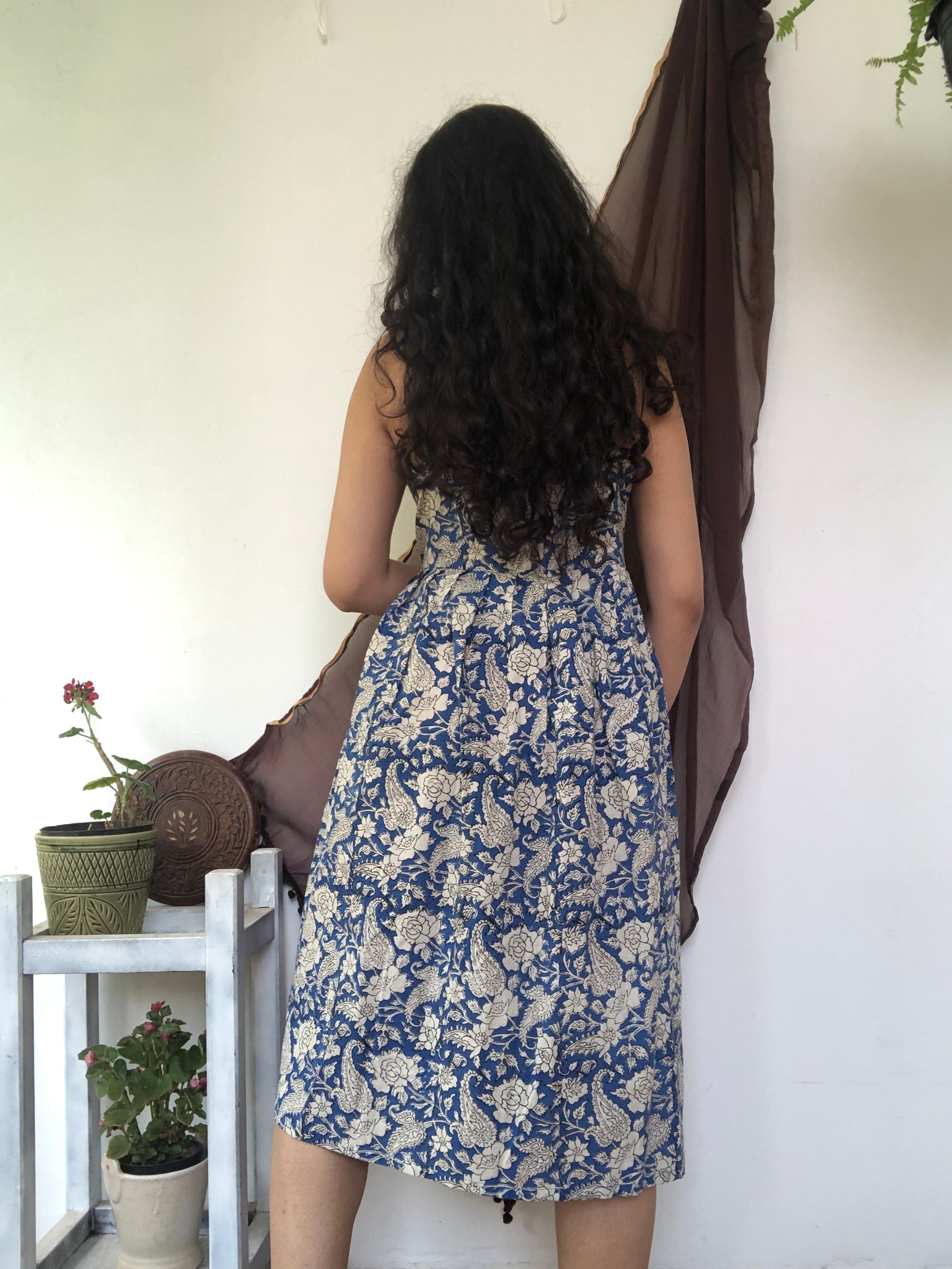 Rock this flirty blue Caroline dress with a handblockprinted sanganeri print and strappy design. Perfect for summer wear, this dress will have you standing out in any crowd. (Summer never looked so good! Slay in this quirky blue dress with a sassy print and summery style.)