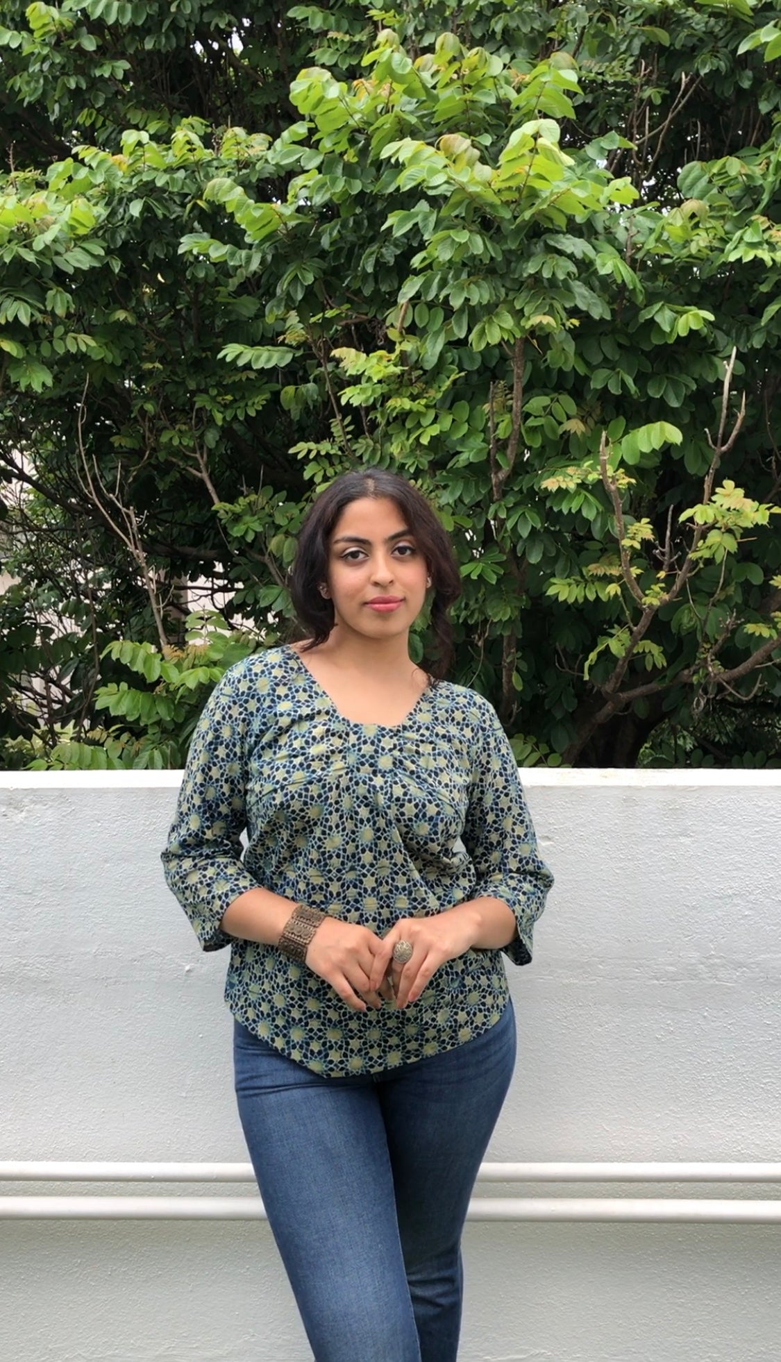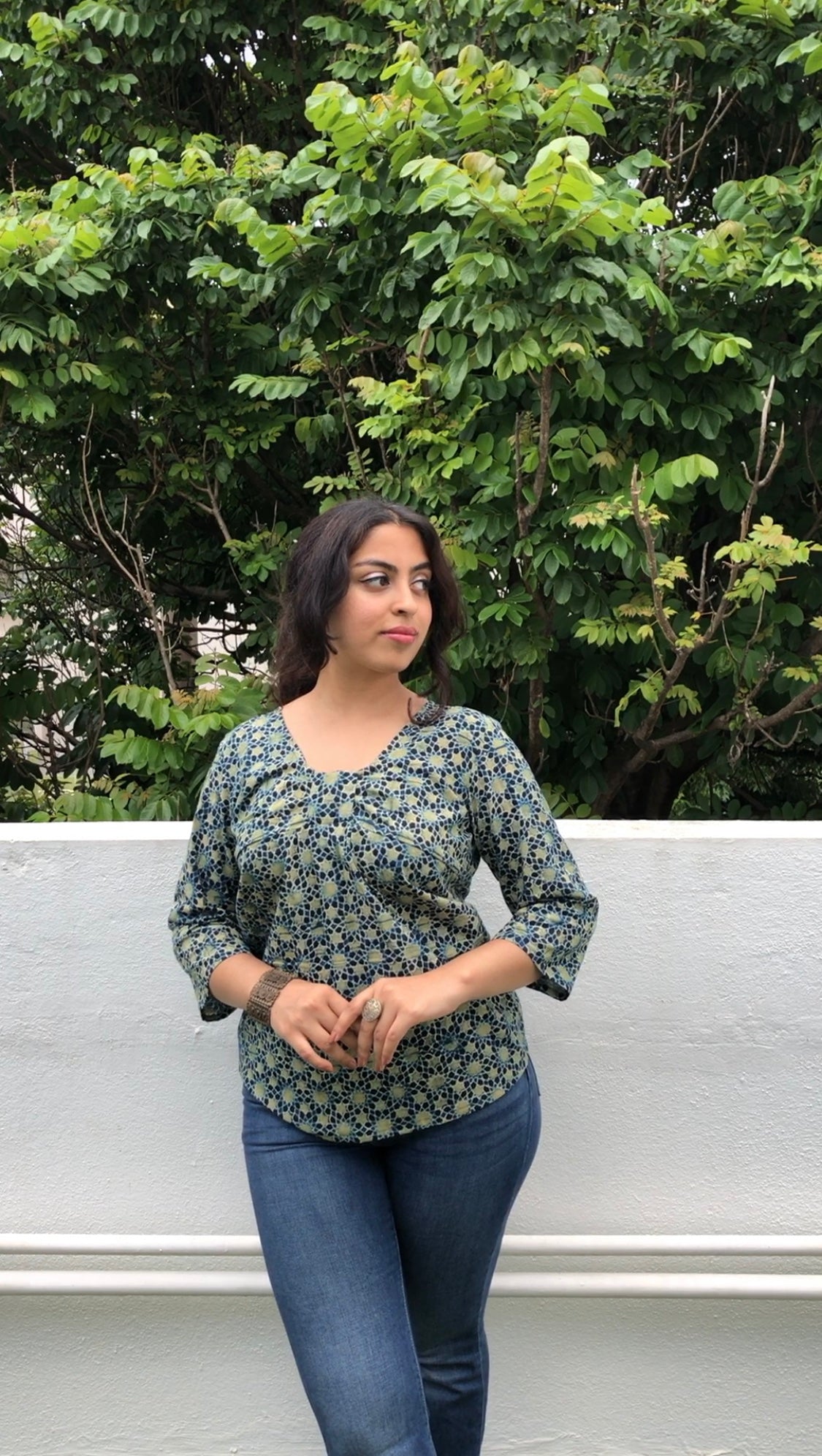 A knotted neckline detailing . Three quarter sleeves. Mid hip length.