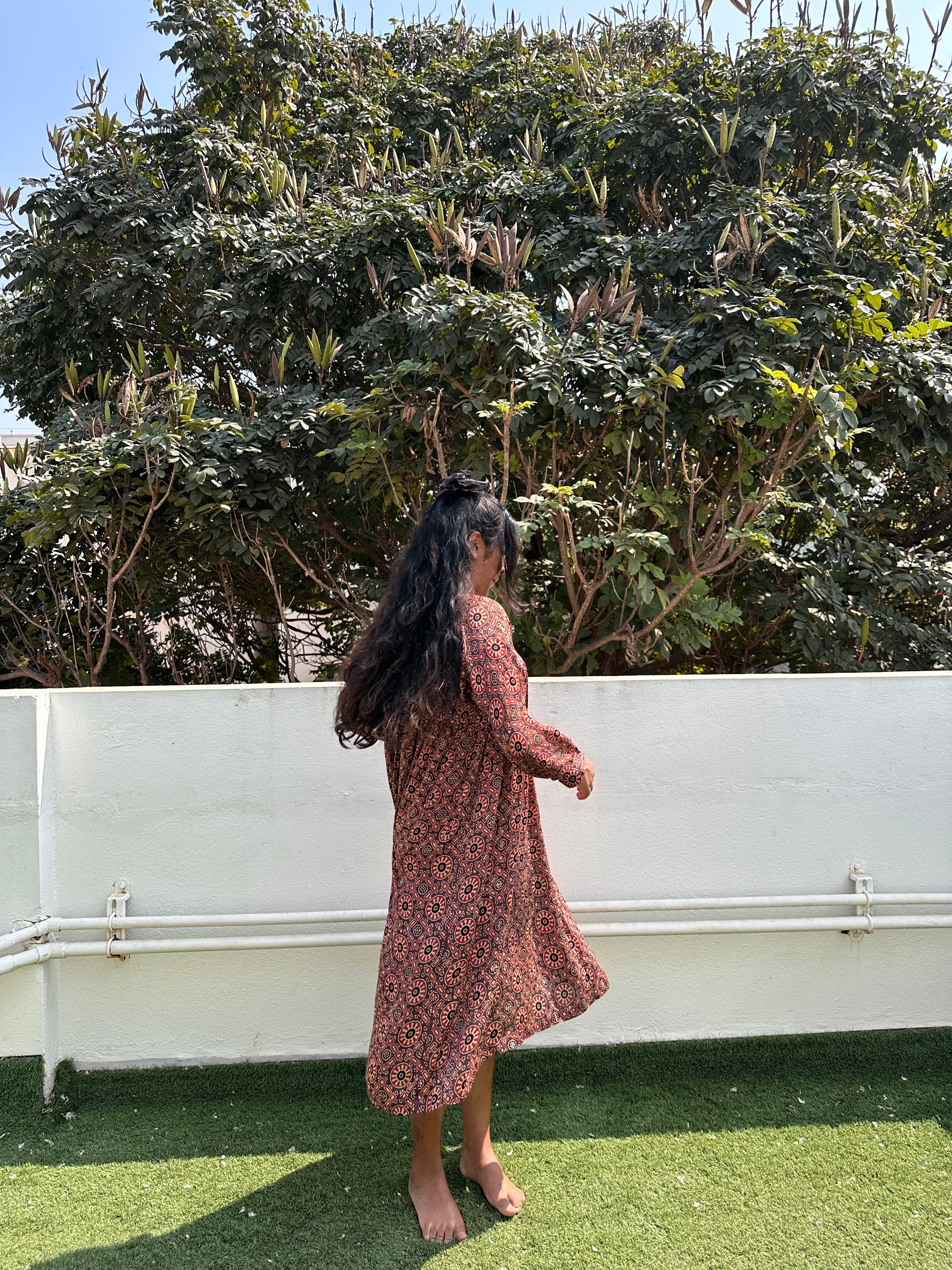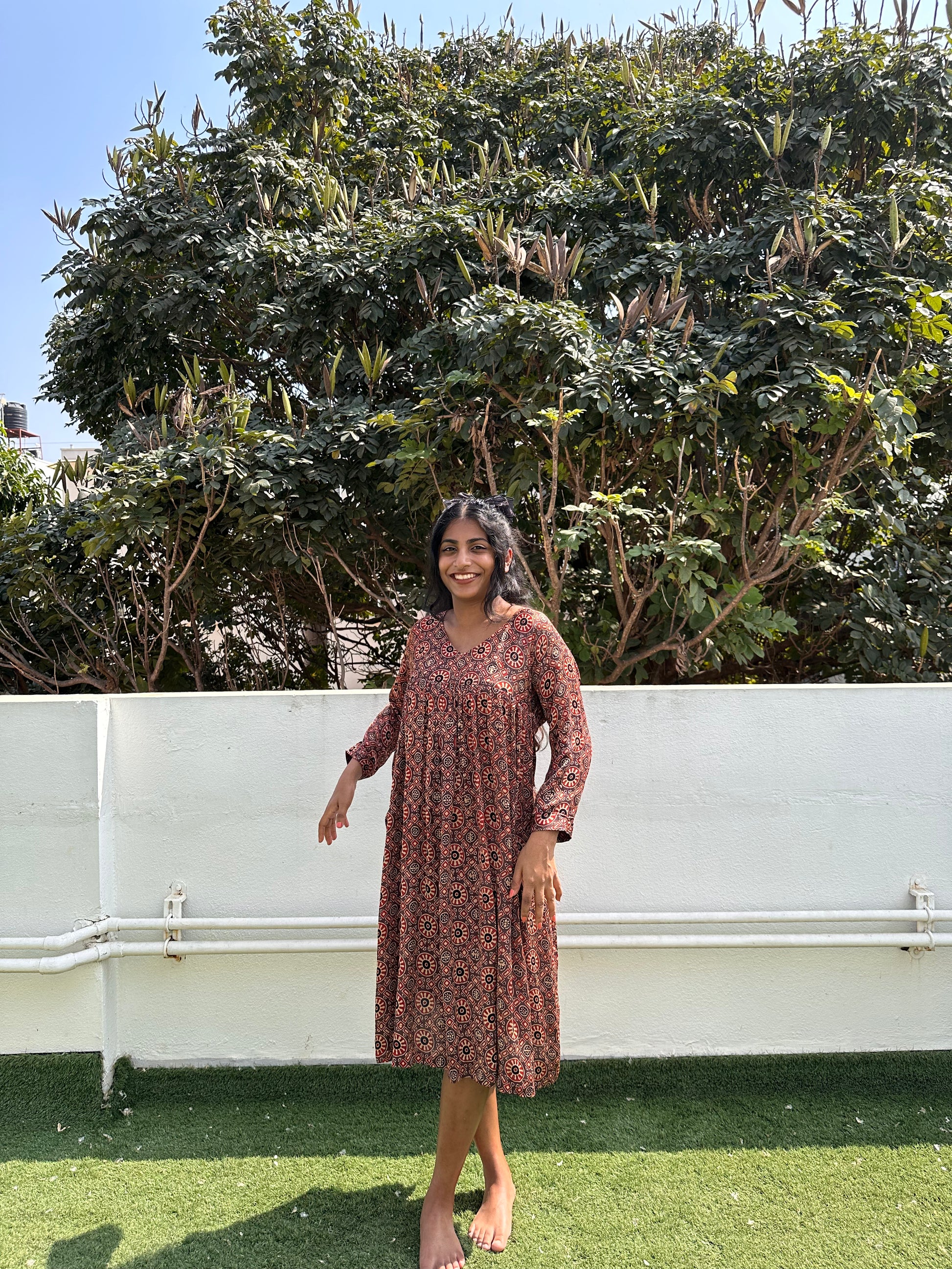 "Be a fashion statement with the Rani dress in brown. Made with luxurious modal silk, this dress features a stunning ajrakh print and a flattering gathered design. You'll feel like a queen in this unique and bold dress. (Regal without the royal price tag!)"