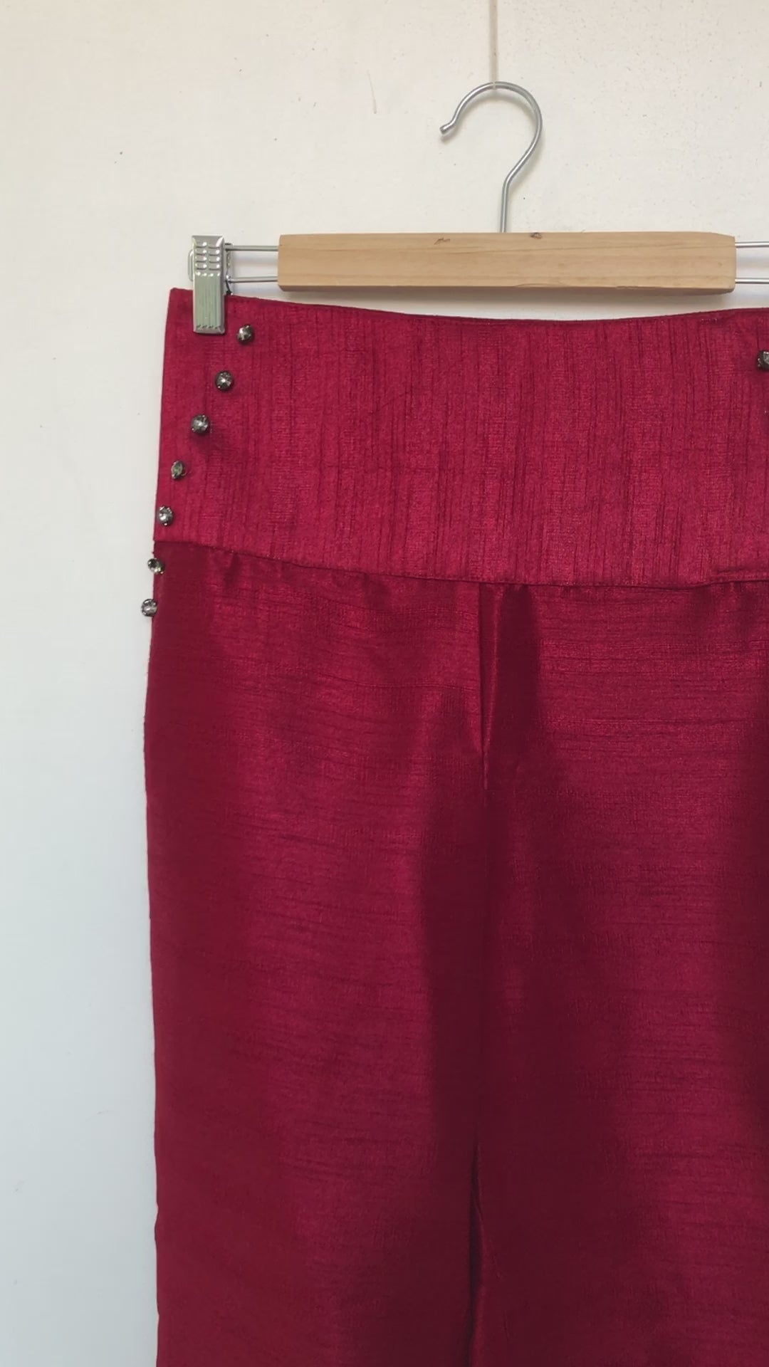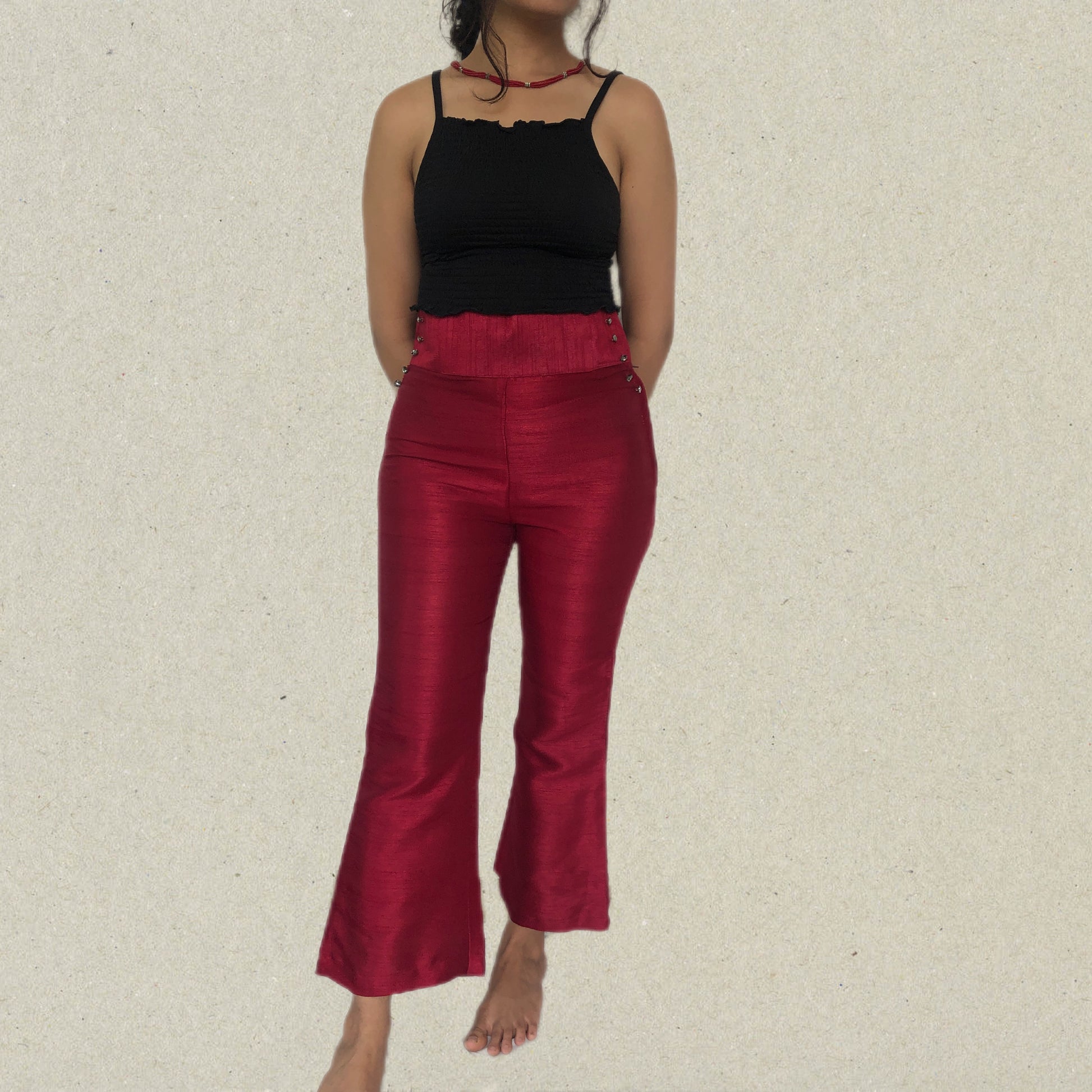 Indulge in a touch of luxury with our red bootcut pants. Handcrafted from raw silk, these trousers exude sophistication and elegance. The vibrant red hue adds a pop of color to your wardrobe, while the flattering bootcut style elongates your legs. Elevate your outfit with these exclusive, artfully-crafted pants.