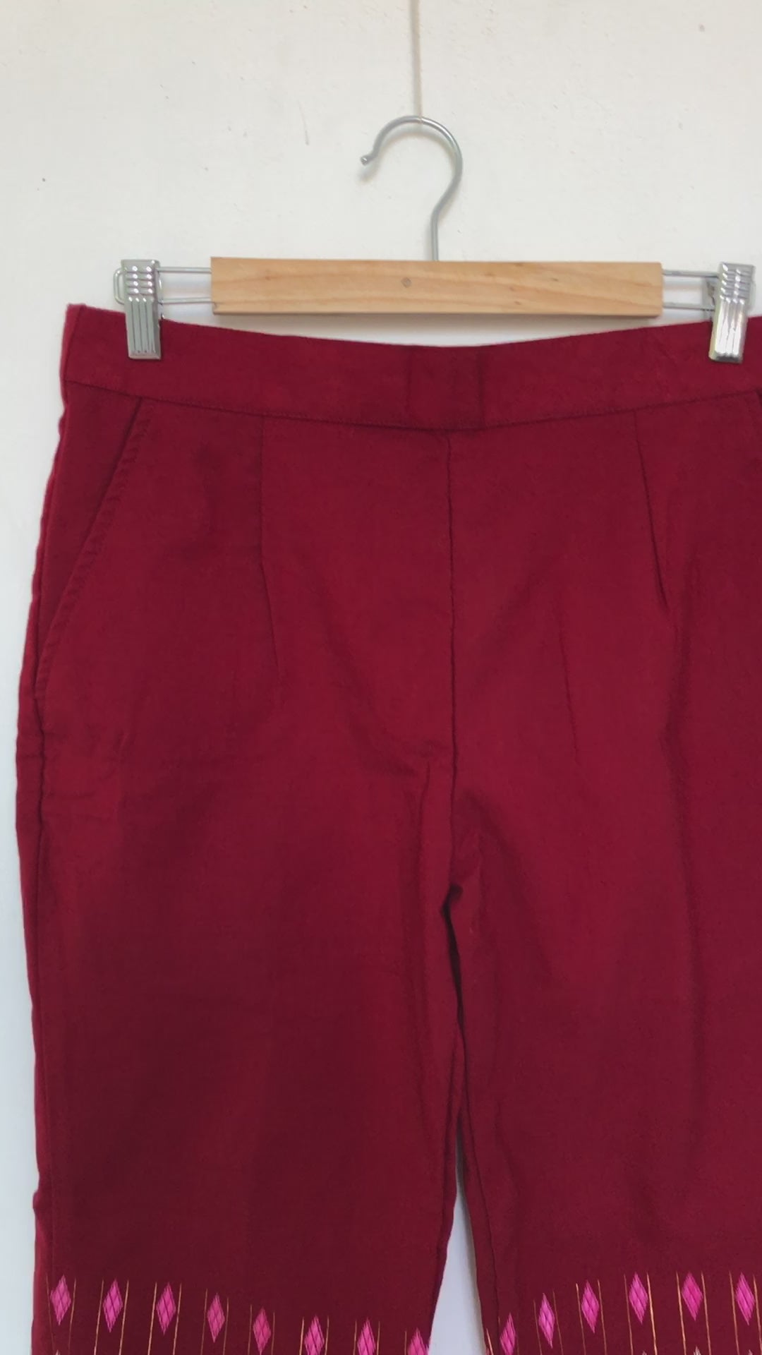 Expertly crafted from handwoven fabric, these red straight pants are a unique addition to any wardrobe. The intricate handwoven design adds a touch of artistry to these trousers, making them a statement piece for any occasion. Elevate your style with these one-of-a-kind pants.