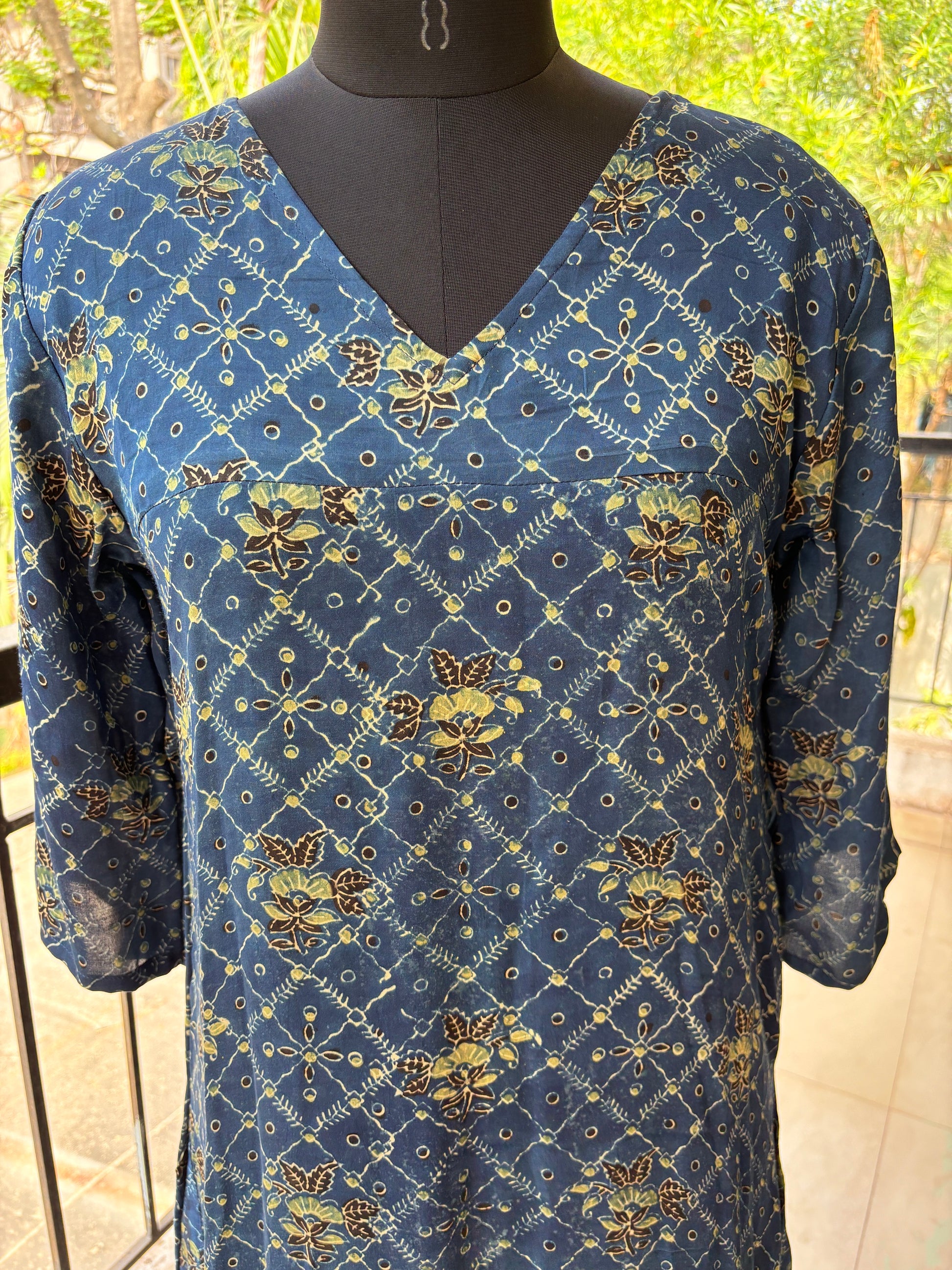 "Indulge in the beauty of nature with our Ajrakh dress in blue. Handblock printed with intricate details, this dress exudes elegance and style. The color adds a touch of sophistication, and the ankle length design makes it perfect for any occasion. Elevate your wardrobe with this timeless piece."